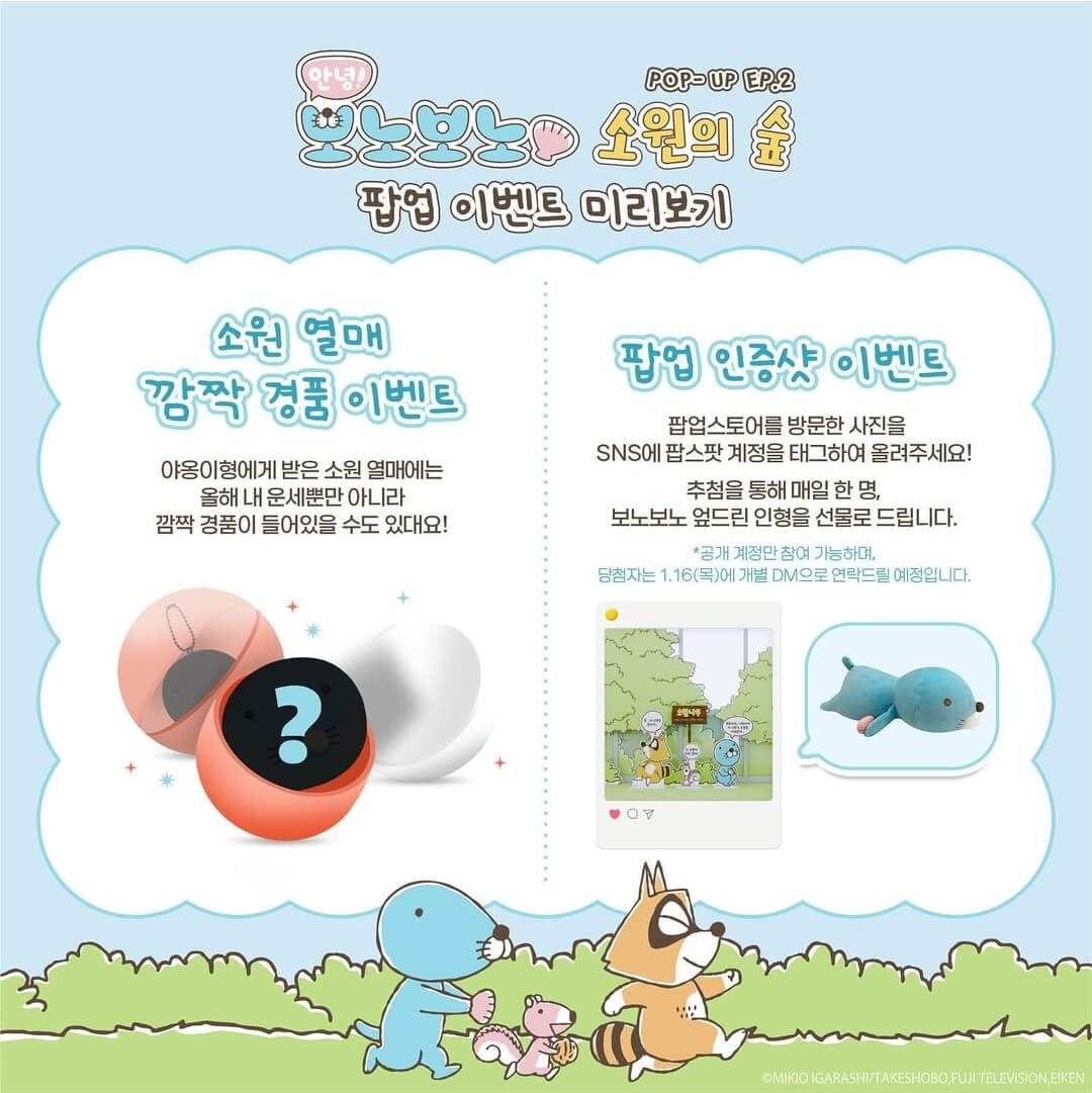 | 소원 나무 | 조개, 호두, 고구마 모양 메모지에 올해의 소원을 적어서 소원 나무에 붙여주세요. 소원나무에 걸린자신의 소원을 찍어서 팝스팟 계정을 태그하여 인스타 스토리에 올리면 매일 한 명, 추첨을 통해 보노보노 슬리핑 인형을 드립니다. (공개 계정만 가능, 당첨자는 1.16(목)에 개별 DM으로 연락) |