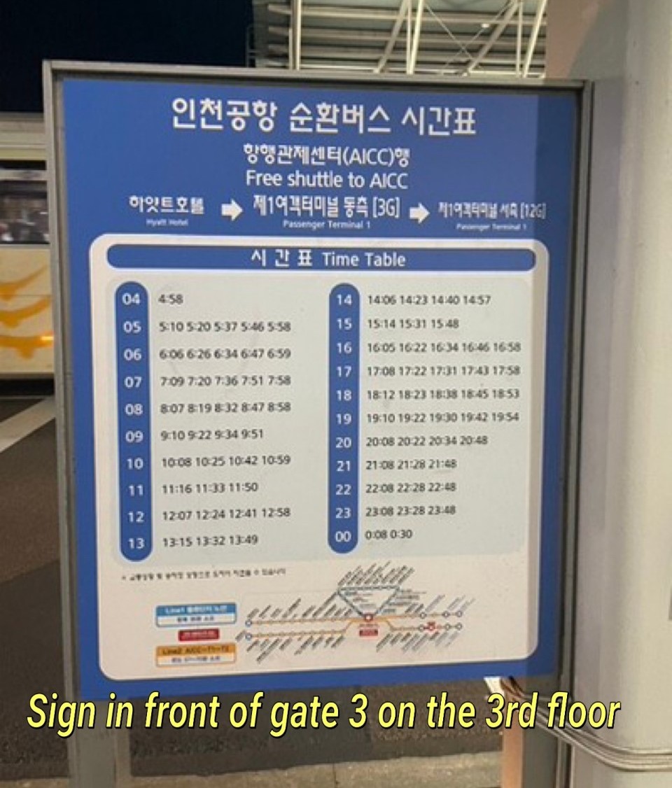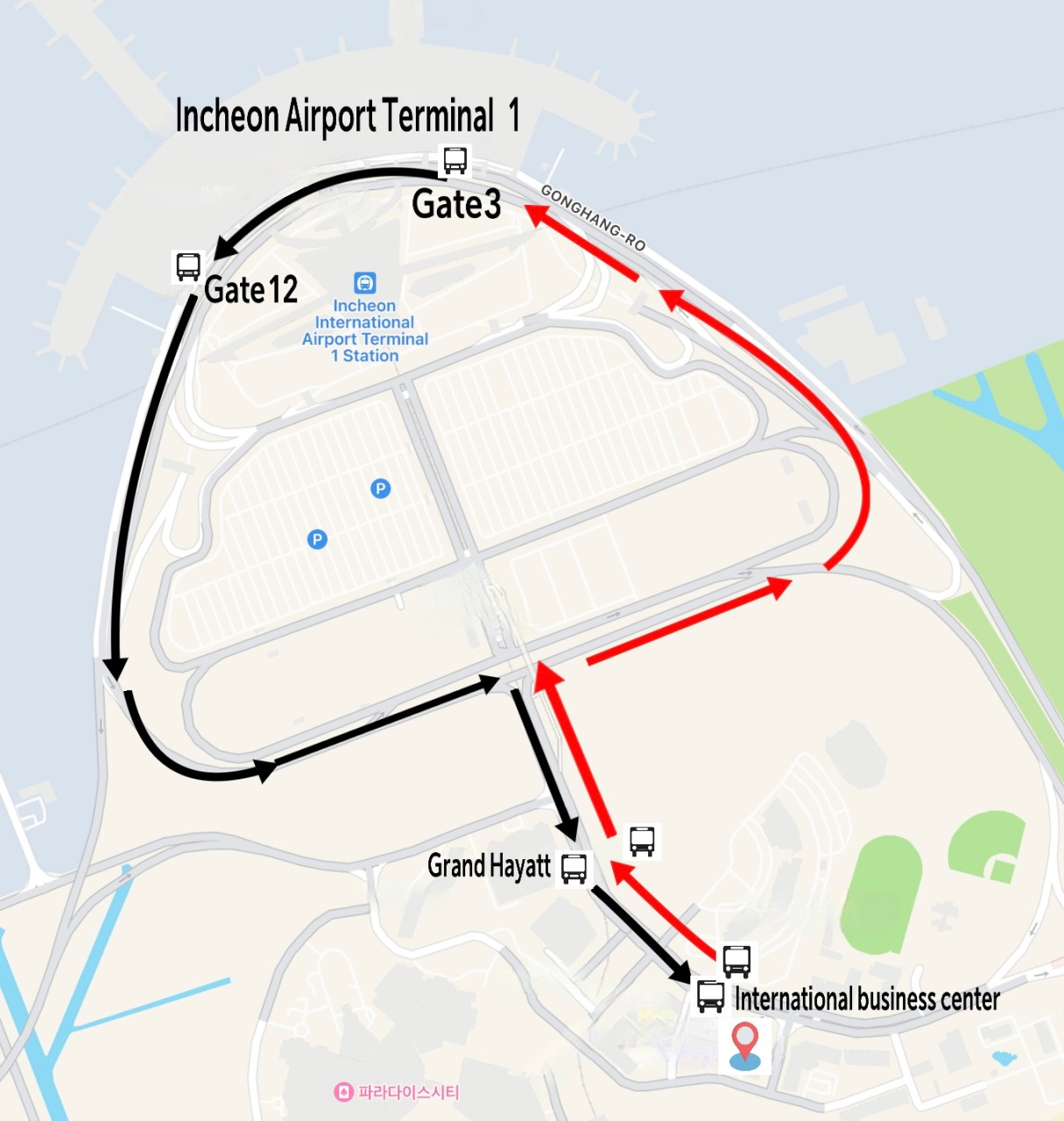 1. 1층 로비를 나가서 횡단보도를 건너세요 2. 왼쪽으로 가면 버스정류장이 있습니다 3. 공항 무료 순환버스를 탑니다 4. 인천공항 터미널에서 하차합니다 |