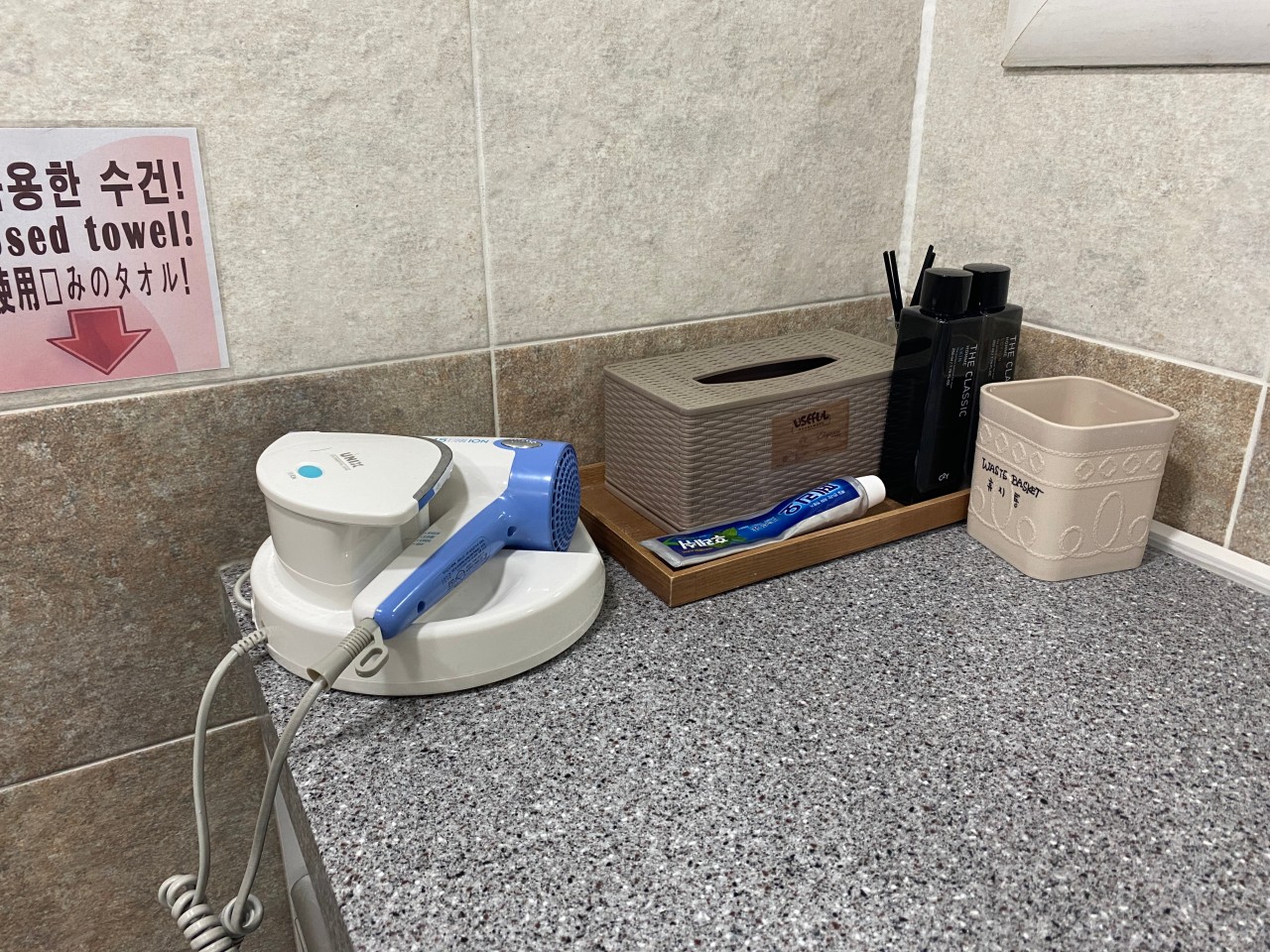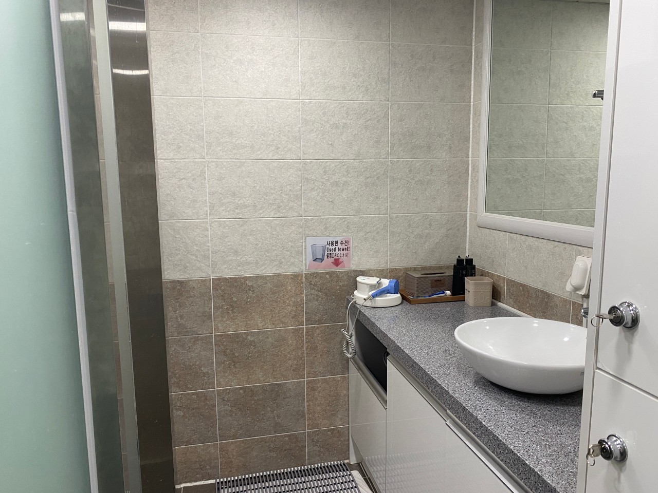 여성 1인 샤워실의 경우 옷 갈아입을 수 있는 공간과 옷을 걸어둘 옷걸이도 있습니다. 화장대와 드라이기, 일회용 칫솔까지 준비되어 있습니다.