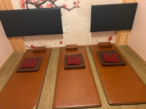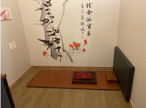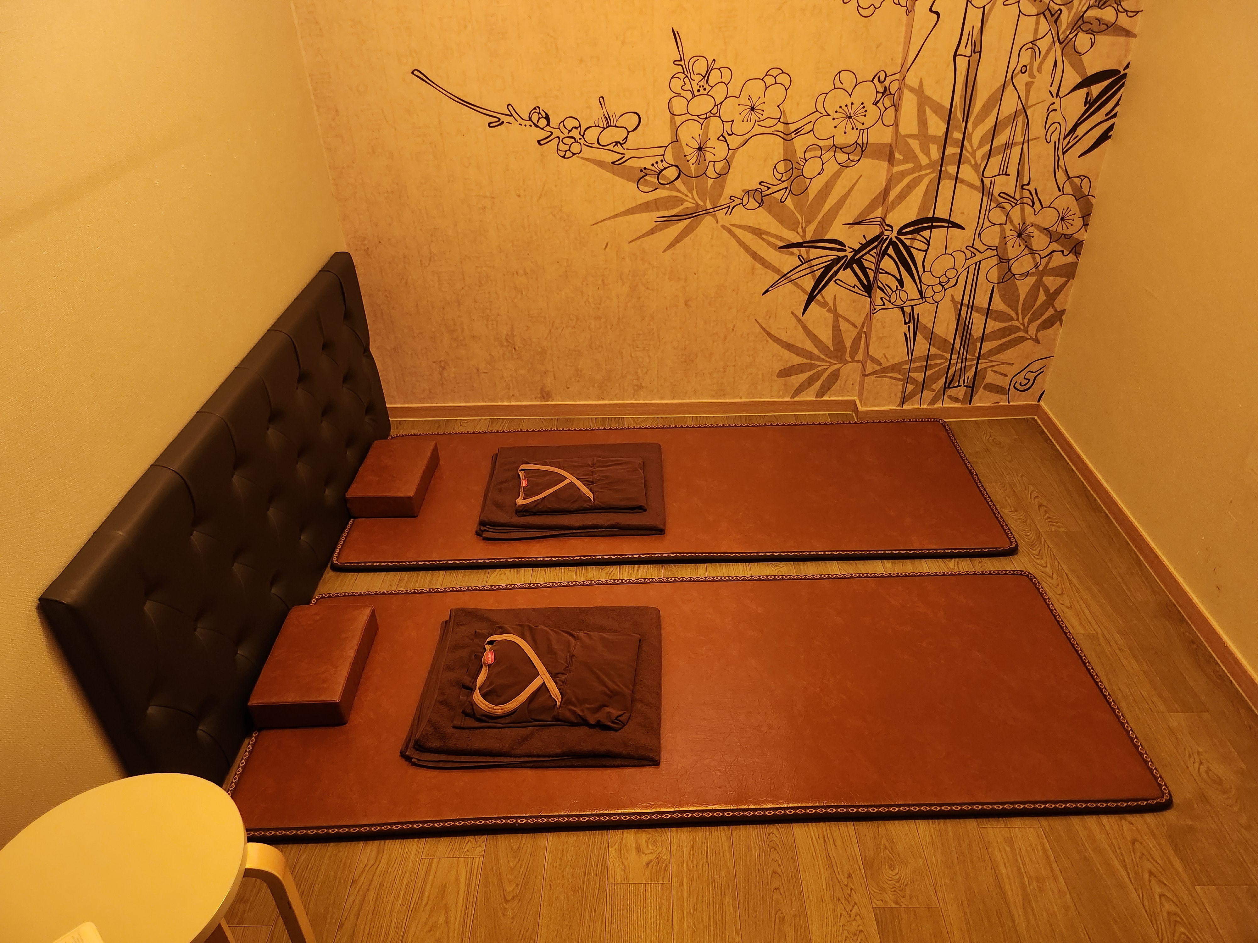 방 안에는 매트와 찜질복, 베개, 덮고 잘 수 있는 수건이 준비되어 있습니다. 작은 화장대와 의자가 구비되어 있으며, 화장대 위에 수건과 일회용 칫솔이 준비되어 있습니다. 드라이기도 사용할 수 있으나 밤 11시 이후에는 사용 불가합니다.