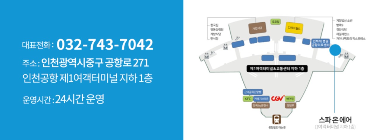 인천공항 내 찜질방 '스파 온 에어'는 제1여객터미널 지하 1층 인하대병원 공항의료센터 옆에 위치하고 있습니다.
