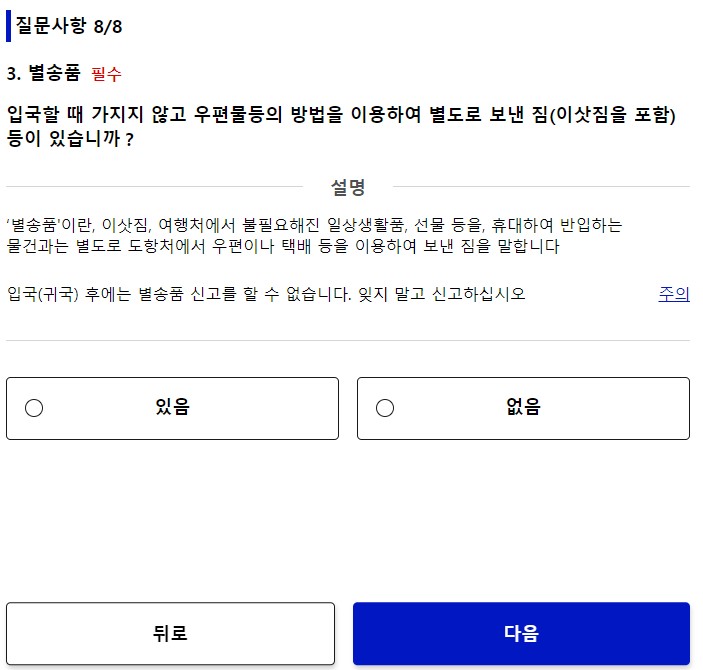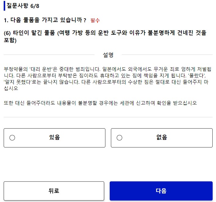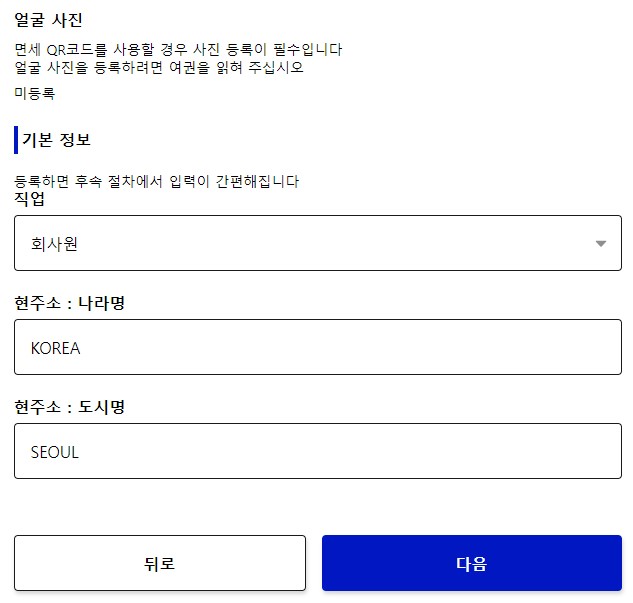 1. 본인 정보를 클릭 후 입국/귀국 수속은 해당 없기 때문에 모두 없음으로 클릭합니다.