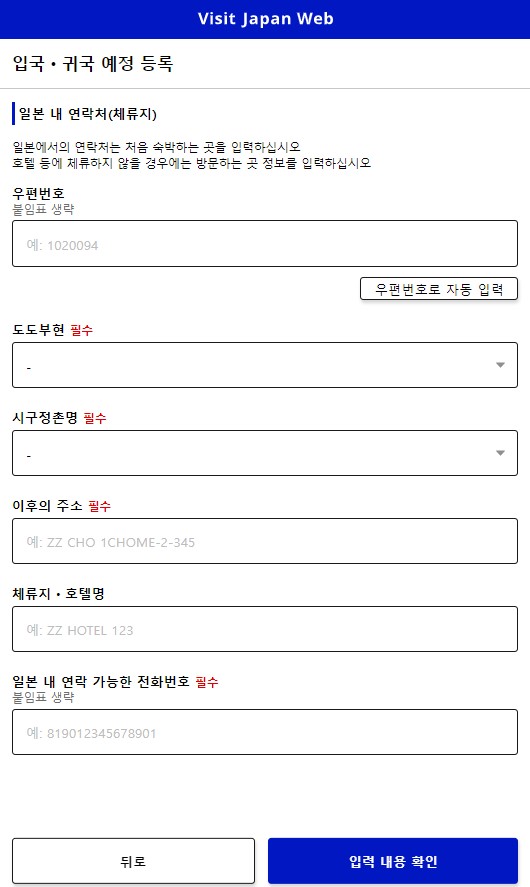 2. 일본 내 연락처 작성 (숙박하는 호텔 정보로 작성)