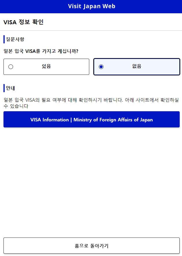 일반 관광객은 비자가 필요 없기 때문에 없음에 체크하시고 홈으로 돌아가기를 클릭합니다.