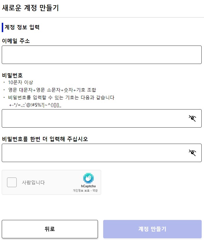 계정을 만들 때 이용약관 및 개인정보 처리방침 확인 후 다음을 클릭하면 이메일주소와 비밀번호를 입력하는 화면으로 넘어갑니다. 이 화면에서 이메일과 비밀번호 입력 후 계정을 만드시면 됩니다.