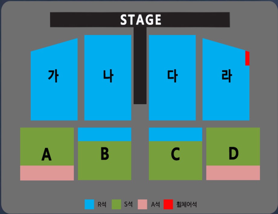 - 휠체어석은 라구역의 빨간색으로 표시된 좌석입니다.