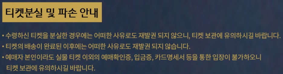 - 예매자 본인이라도 실물 티켓 이외의 예매확인증, 입금증, 카드명세서 등을 통한 입장이 불가능하니 티켓 보관에 유의하시기 바랍니다.