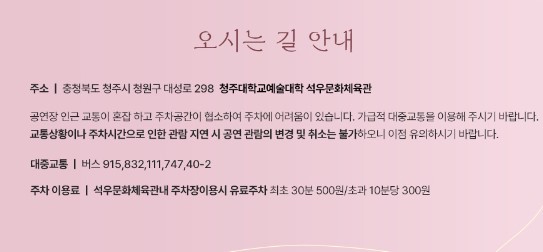 - 주소: 충북 청주시 청원구 대성로 198 청주대학교 예술대학 석우문화체육관