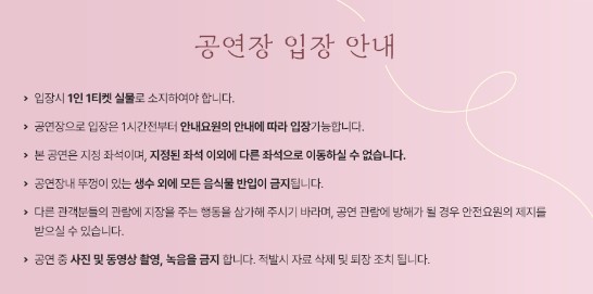 - 공연장 내 뚜껑이 있는 생수 외에 모든 음식물 반입이 금지됩니다.