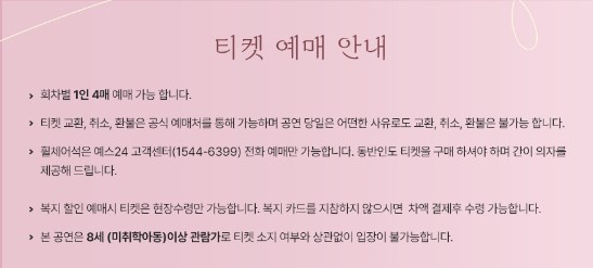 - 휠체어석은 YES 24 고객센터 (1544-3699)를 통한 전화 예매만 가능합니다. 동반인도 티켓을 구매하셔야 하며, 간이 의자를 제공해 드립니다.