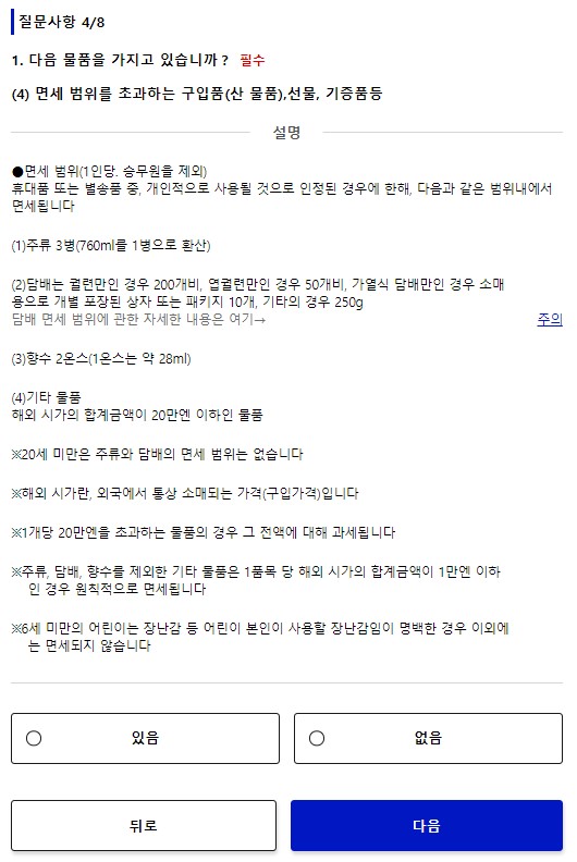 2. 면세 수속 이용확인의 경우 해당하시는 분들은 있음으로 클릭 후 다음으로 넘어가시면 됩니다.